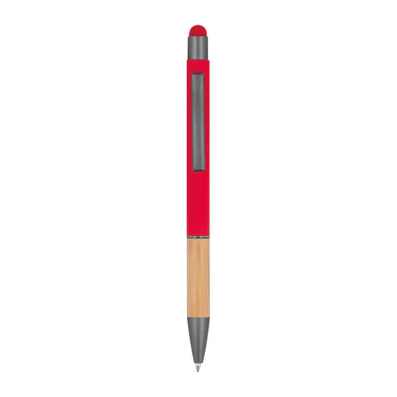 Hliníkové guľôčkové pero s modrou náplňou, dotykovou funkciou, matnými, striebornými aplikáciami a bambusovou rukoväťou.