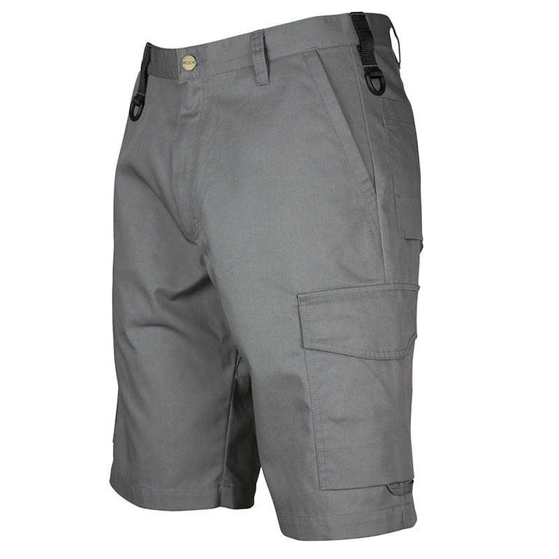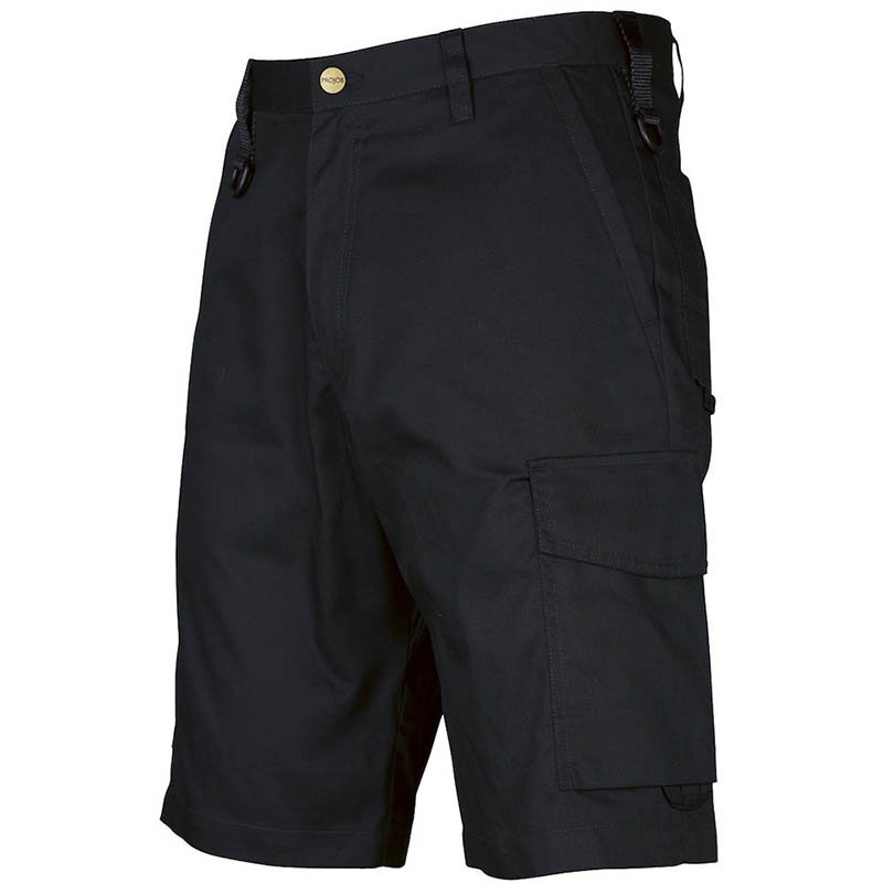 Shorts without front pleat. Side pockets in front, safety pocket with zipper on right side. Two exterior back pockets. Two leg pockets. Left leg pocket has flap and interior mobile telephone pocket. Right leg pocket has room for mobile telephone, pens, paper and folding rule. D-ring in front. Loops under back pockets and leg pockets for attaching Inbags. Material: 65% polyester, 35% cotton 245 g/m2 Colour: khaki-82, black-99, navy-58, stone-83 Size: C44–C62