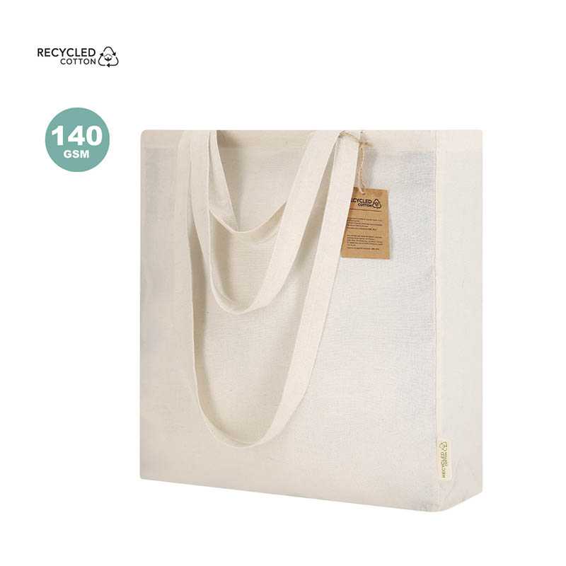 NOVINKA 2025. Bag with gusset made mainly of recycled cotton 140g/m2. It has double handles: long handles of 70 x 2.5 cm and short handles of 30 x 2.5 cm. Includes recycled cotton label. Resistance up to 6 kg.