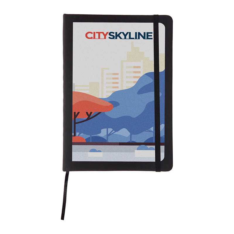 Poznámkový blok so 100 listami, záložkou a gumičkou.