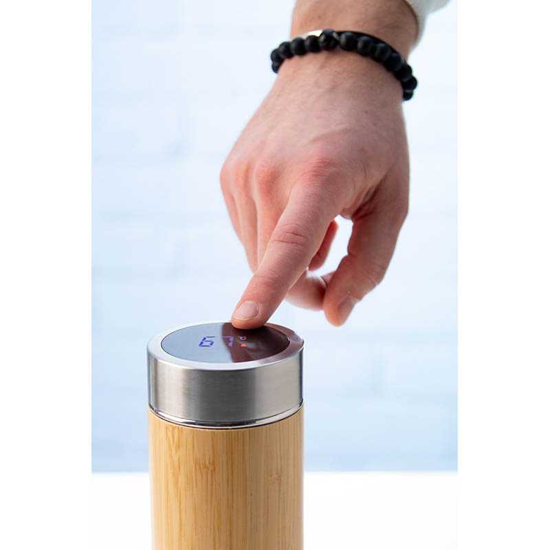 Dvojstenná termoska z nerezovej ocele a bambusu, so sitkom na čaj a dotykovým LED teplomerom na vrchnáku. 500 ml. S gombíkovou batériou.