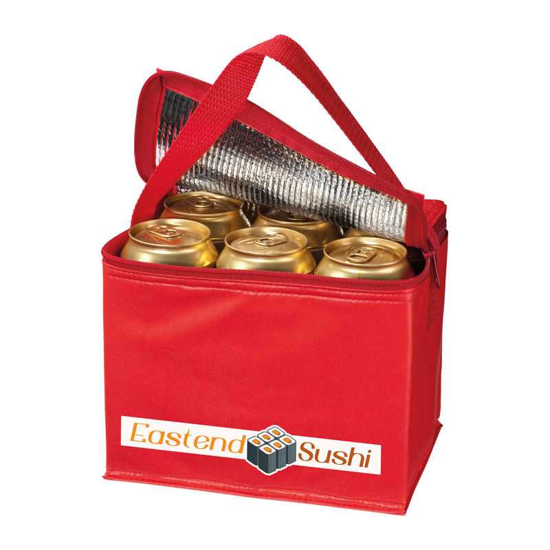 Malá chladiaca taška na 6 plechoviek s objemom 500ml alebo 6 malých fliaš. Taška je vyrobená z polyesteru vystlaná fóliou udržujúcou chlad.