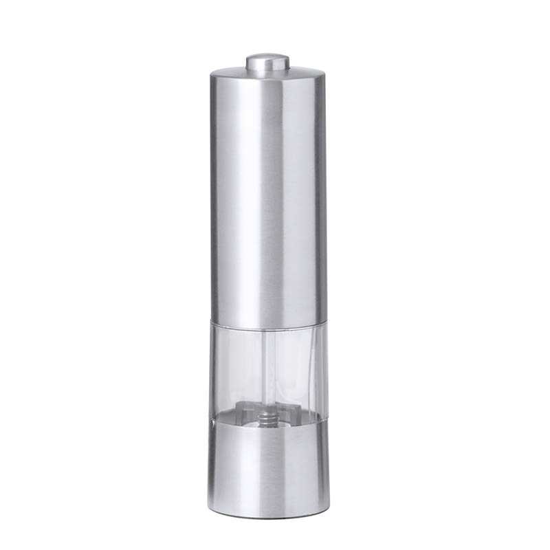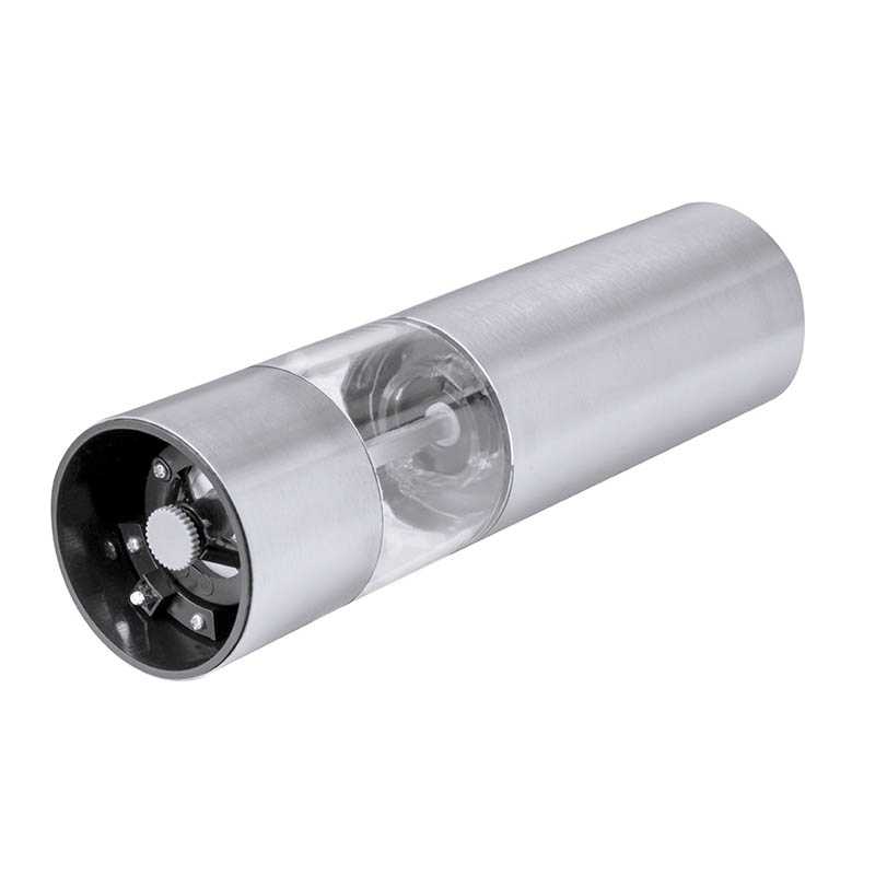 NOVINKA 2025. Electric salt and pepper mill in stainless steel. Ideal for adding the most desired spice in the 70 ml compartment, spicing by pressing the top button and adjusting the size of the grain. With a window to view the amount of spice remaining and LED light. Powered by 4 AAA batteries (not included) and presented in a kraft design box.