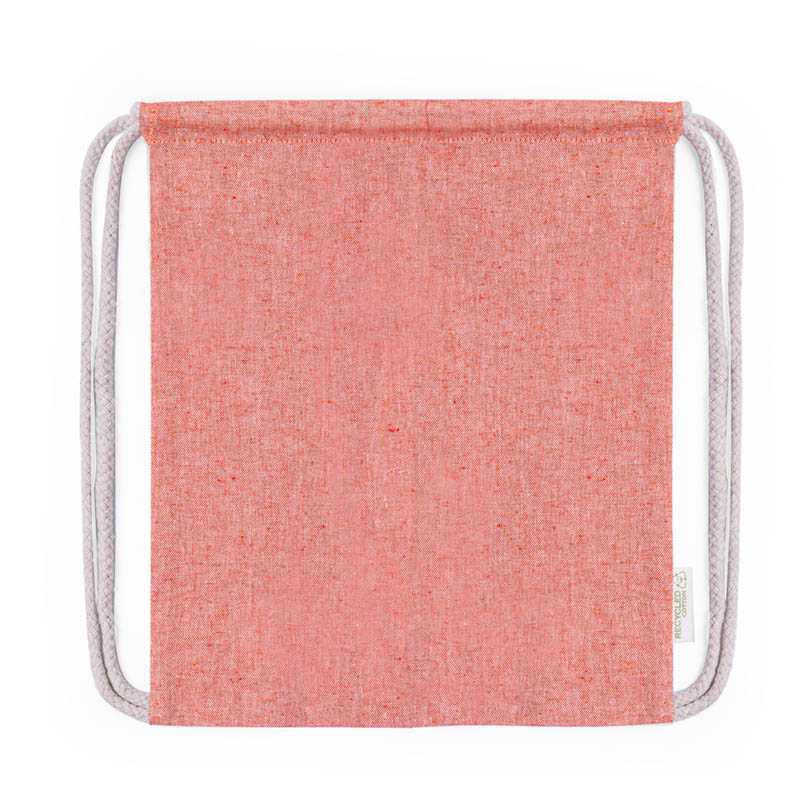 NOVINKA 2025. Drawstring backpack in Recycled cotton material 120 g/m2. Self closing strings in cotton, with eco label on one side and available in a wide range of nature colours. Resistance up to 4kg in weight.