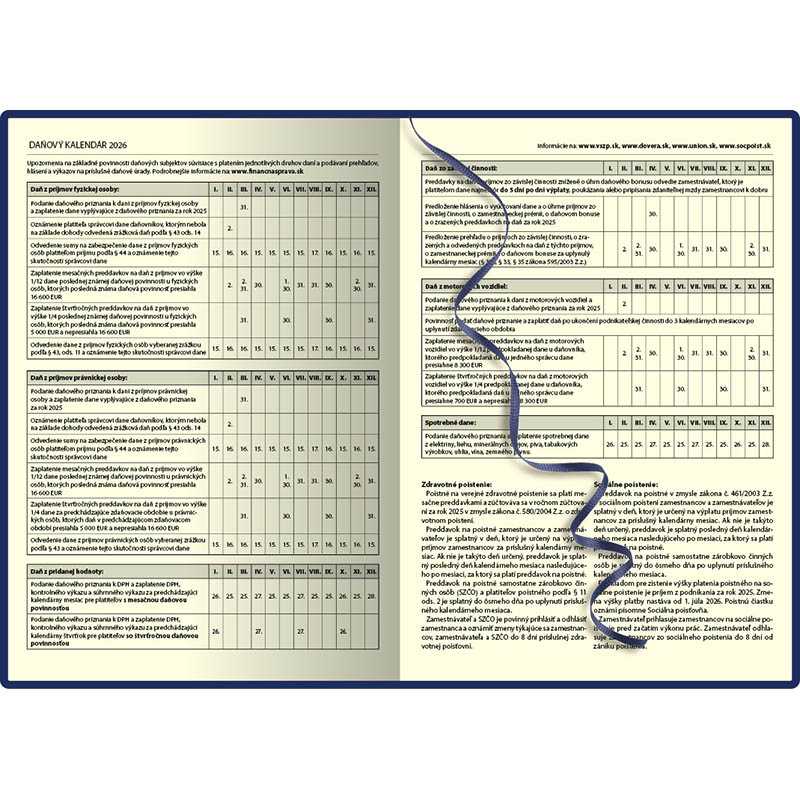 Nový rad diárov s výrazným letopočtom. Povrch má jemnú štruktúru a je vhodný pre všetky typy razieb. Týždenné rozloženie s česko-slovenským kalendáriom a doplnkovou angličtinou, nemčinou, maďarčinou a ruštinou.• kalendárium od decembra 2025• mesačný plánovací kalendár 2026 • mesačný plánovací kalendár 2027• ročný plánovací kalendár 2026–2027 • pracovný plánovací kalendár • sviatky Českej a Slovenskej republiky a zahraničné sviatky• mapa Českej a Slovenskej republiky < • miesto pre osobné údaje • textilná záložka • perforované rožky • priestor na poznámkyRozsah: 144 strán. Rozmer: 15 x 21 x 2 cm. Hmotnosť: 0,28. Papier: 90 g/m2 krémový papier. Väzba: tuhá knižná. Kalendárium: 6 jazyčné (CZ, SK, GB, DE, HU, RU) .