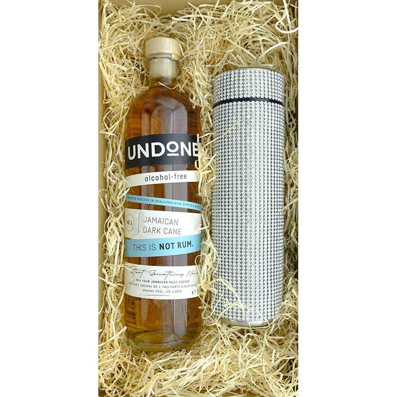 Darčeková krabica > prírodná > 36,5x20x9,5 cm, Nealkoholický rum, Undone No.1 Not Rum, 0%, 700 ml, Veľká nerezová fľaša s trblietavými kamienkami, 500 ml > šedá