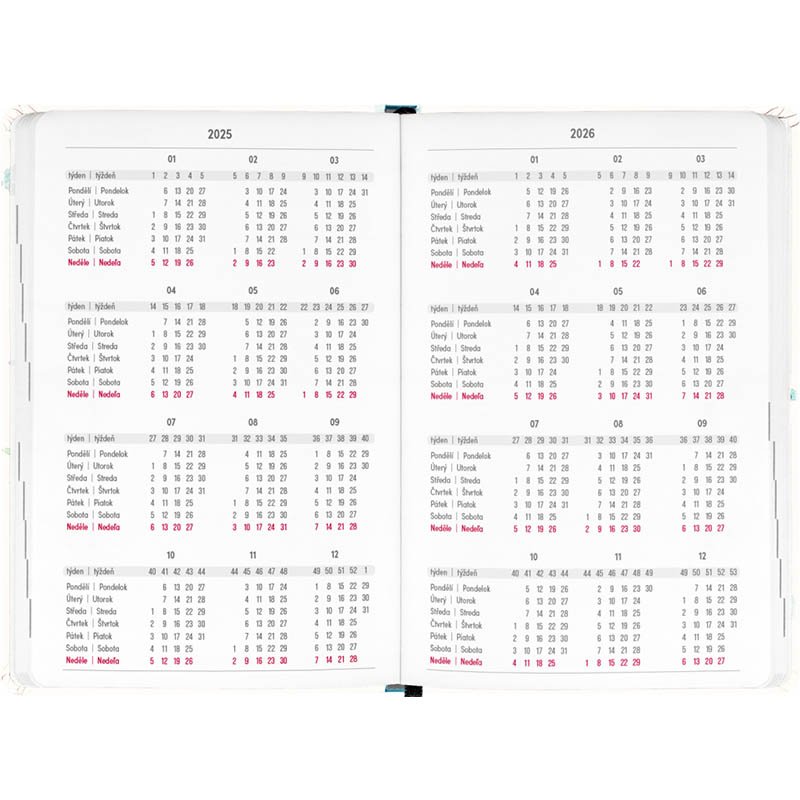 Osemnásťmesačný diár obsahuje prehľad na rok 2025 a 2026, zoznam českých a slovenských mien, česko-slovenské týždenné riadkové kalendárium s menami a sviatkami a priestor na poznámky. Kalendárium začína v júli 2025 a končí v decembri 2026.Rozsah: 192 strán. Rozmer: 11 x 17 x 2 cm. Hmotnosť: 0,2. Papier: 80 g/m2. Väzba: tuhá knižná. Kalendárium: týždenné 18 mesačné 2 jazyčné (CZ, SK).