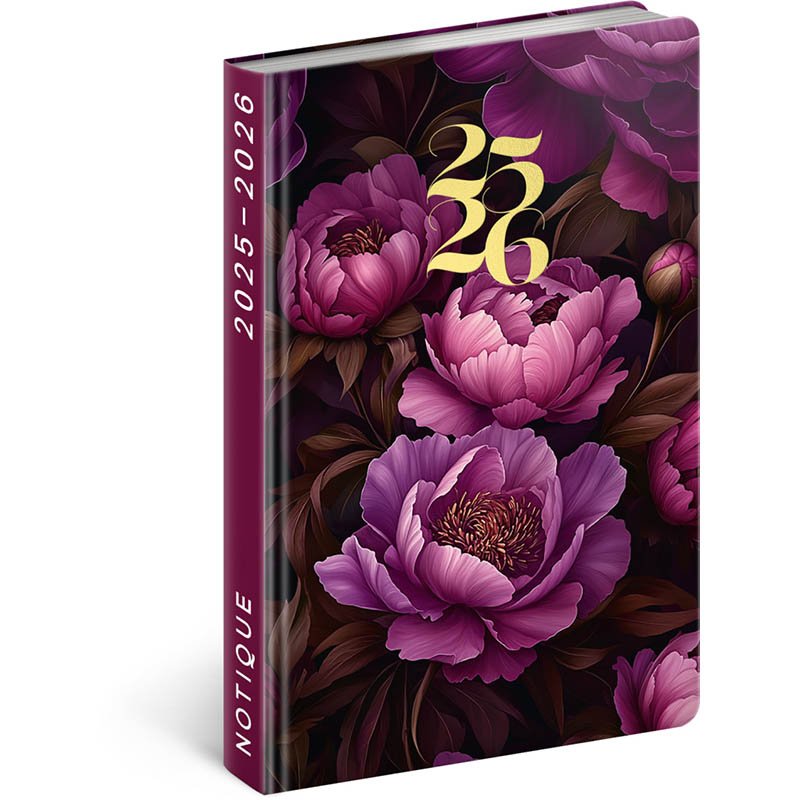 Osemnásťmesačný diár obsahuje prehľad na rok 2025 a 2026, zoznam českých a slovenských mien, česko-slovenské týždenné riadkové kalendárium s menami a sviatkami a priestor na poznámky. Kalendárium začína v júli 2025 a končí v decembri 2026.Rozsah: 192 strán. Rozmer: 11 x 17 x 2 cm. Hmotnosť: 0,2. Papier: 80 g/m2. Väzba: tuhá knižná. Kalendárium: týždenné 18 mesačné 2 jazyčné (CZ, SK).