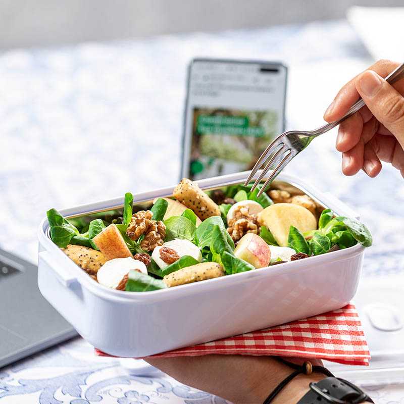 NOVINKA 2025. PP hermetický box s objemom až 1 L. Veko má priehradku na príbory (súčasťou balenia). Dóza je vhodná do mikrovlnnej rúry, veko je potrebné odstrániť. Neodporúča sa na tekutiny. 210 x 145 x 80 mm