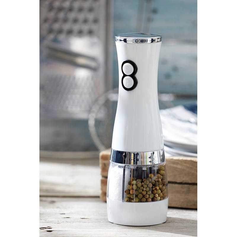 Elektrický mlynček na korenie a soľ, obe polovice môžu byť prevádzkované osobitne, s 2 oddelenými tlačidlami.