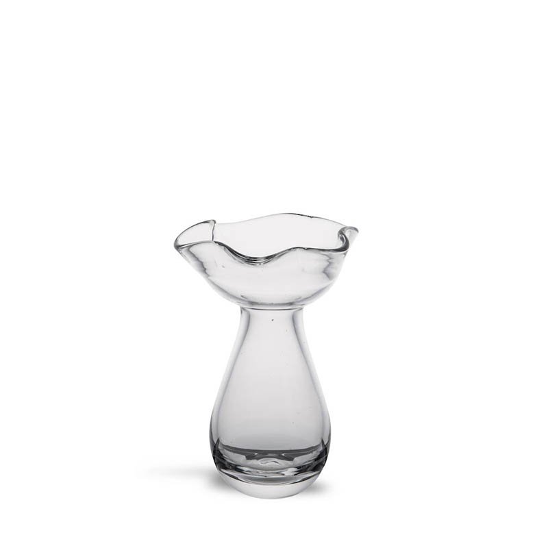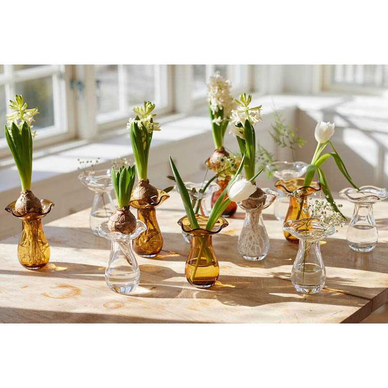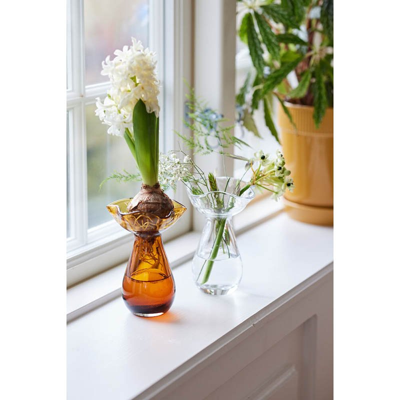 Inspired by the power sources of nature, vase Viva mini becomes a beautiful original. The top of the vase makes you think of a budding flower, while the shape of the base is taken from a raindrop. Hyacinth bulbs fit perfectly in the rounded top, and small flowers or cuttings also stand firm. We like to give sad looking bouquets a new life by snipping off the tops to adorn Viva vase mini. The vase looks beautiful on its own but also together with other vases from the Viva collection. Available in two colours – clear and amber. Material: Mouth-blown glass Size: 10x10x14cm