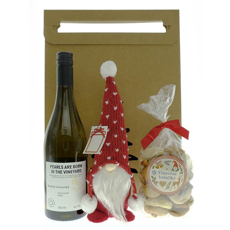 Darčeková taška stredná > prírodná > 40x28x10 cm, Vianočné koláčiky 250g, Vianočný škriatok > červená, Karpatská perla-Víno /MUŠKÁT MORAVSKÝ/ Suchý vrch, biele suché, 19°NM, 2024, (0,75l)