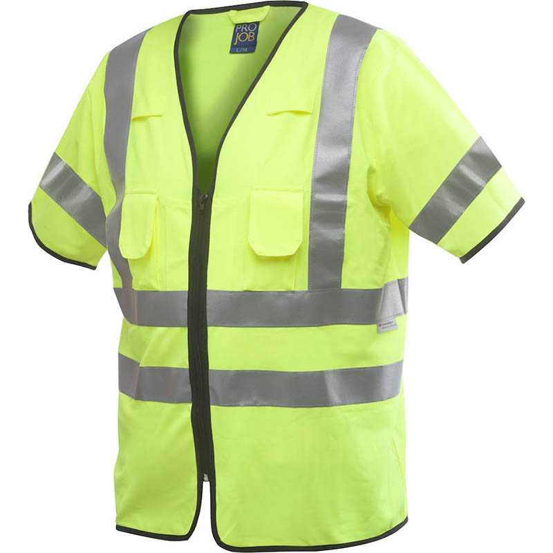Vest with zipper closure at front. Adjustable width in the back. Two small breast pockets. Available in three sizes. Material: 100% polyester. Safety class: EN ISO 20471-CLASS 3 Colour: ProJob yellow-10, Orange-17 Size: S/M (chest 129,5 cm, body lenght: 74 cm, sleevelenght: 27 cm) L/XL (chest 135,5 cm, body lenght 76 cm, sleevelenght: 28,5 cm) 2XL/3XL (chest 141,5 cm, body lenght78 cm, sleevelenght: 30 cm)
