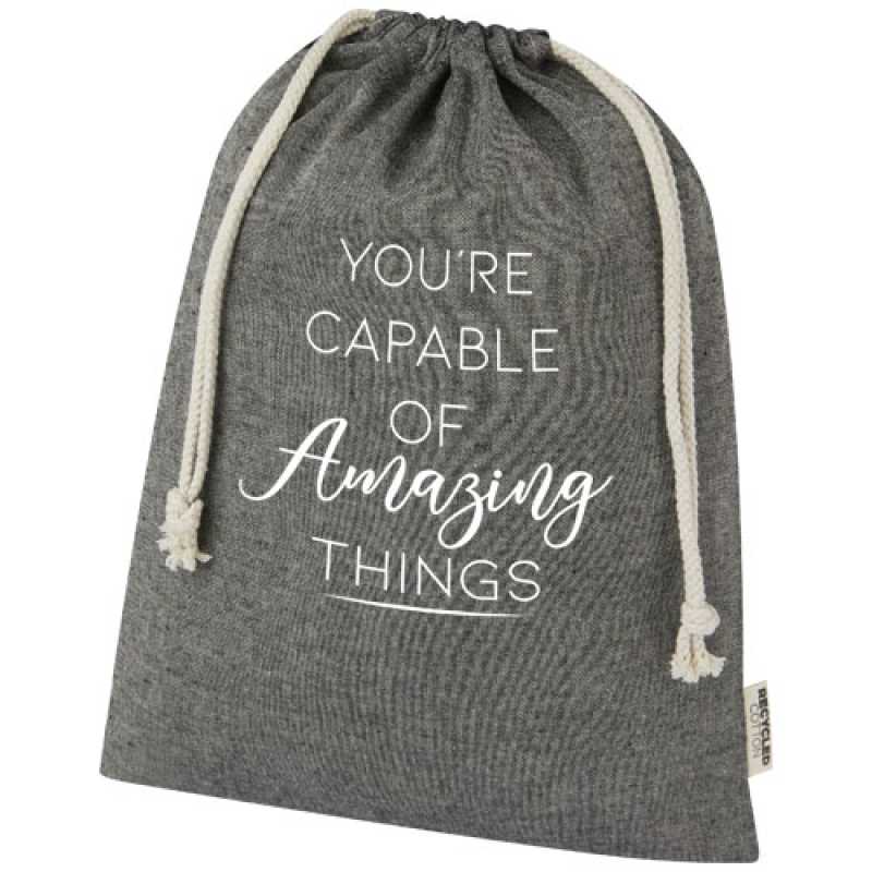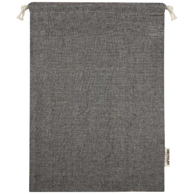 Dárková taška z recyklované bavlny certifikované GRS s bavlněným šňůrkovým uzávěrem. Ideální pro dávání dárků nebo ukládání předmětů. Velikost: 30 x 42 cm.