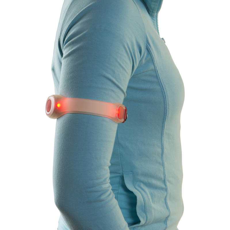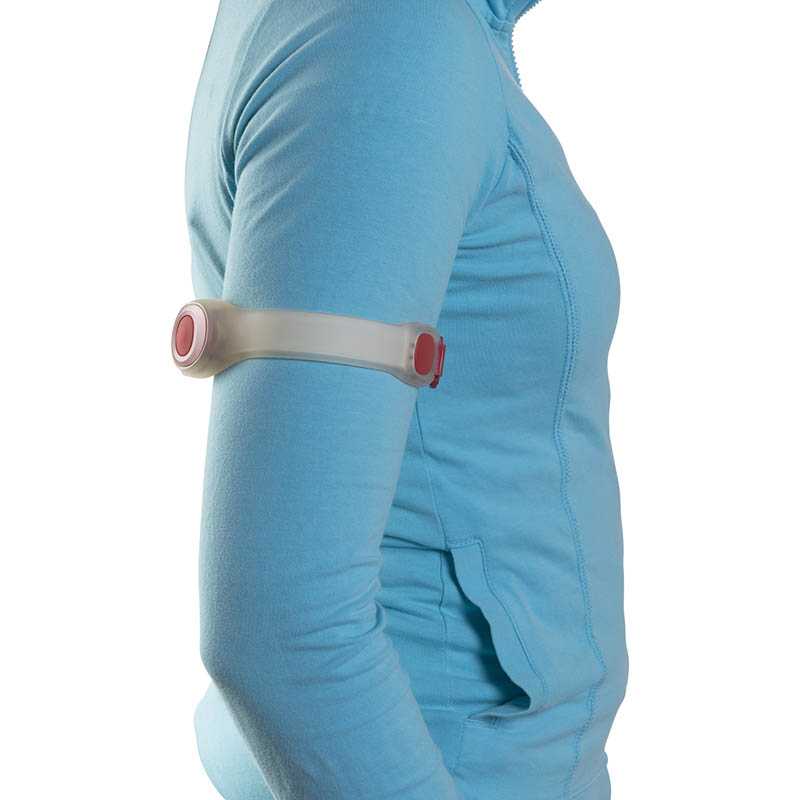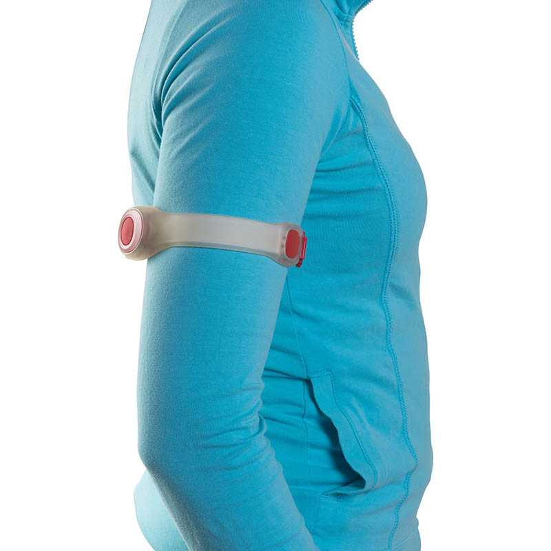 Silicone arm strap with two LEDS and blinking functions, to be fastened with an elastic Velcro band. Batteries included.