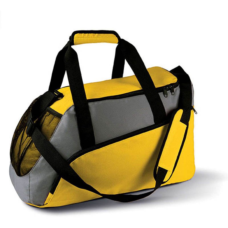 Polyester (600D) sports bag with front zipped pocket and adjustable shoulder strap.