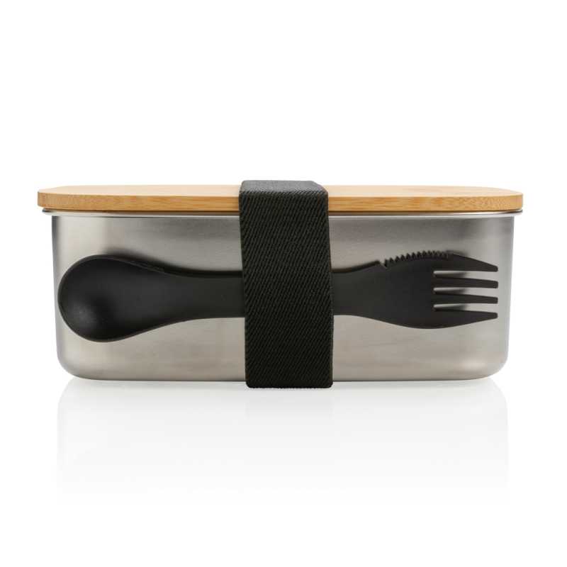 Štýlová a veľmi odolná krabička na jedlo pre každodenné použitie. Ideálna k prenosu jedla do práce, do školy alebo na cesty. Krabička vyrobená z nehrdzavejúcej ocele, veko z bambusu. Nie je vhodná do mikrovlnnej rúry. Len pre ručné umývanie. Vrátane lyžičky a vidličky 2 v 1 a elastickej gumičky. Objem: 900 ml.