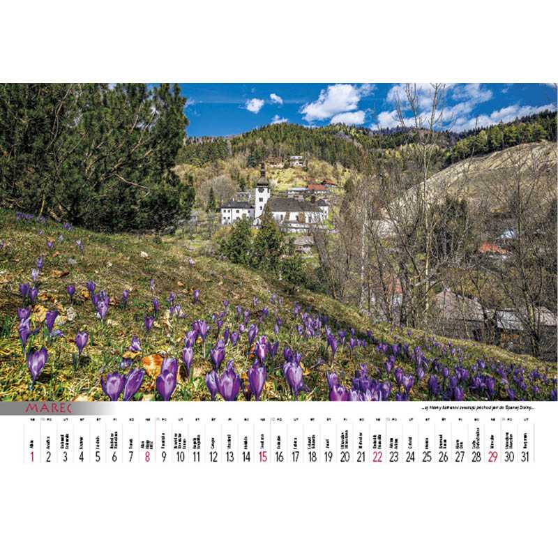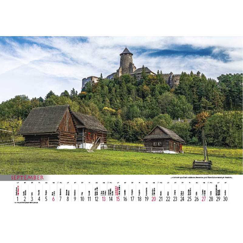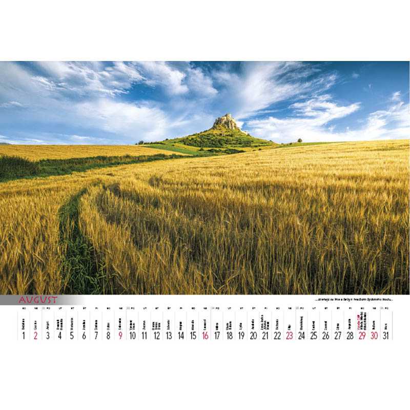 Kalendár obsahuje fotografie architektonických aj prírodných pamiatok z celého Slovenska. Kalendár výškového formátu obsahuje slovenské kalendárium s menami, sviatkami, fázami mesiaca a trojmesačným prehľadom na každý mesiac. S priestorom na poznámky.Priestor na potlač: 33 x 6 cm. Rozsah: 14 listov. Rozmer: 33 x 46 x 1 cm. Hmotnosť: 0,6. Papier: 150 g/m2. Väzba: dvojitá špirála. Kalendárium: slovenské.