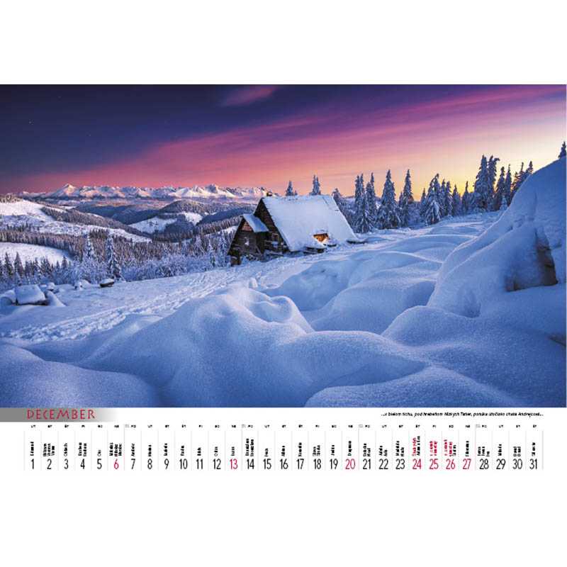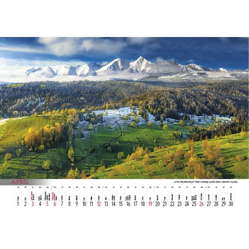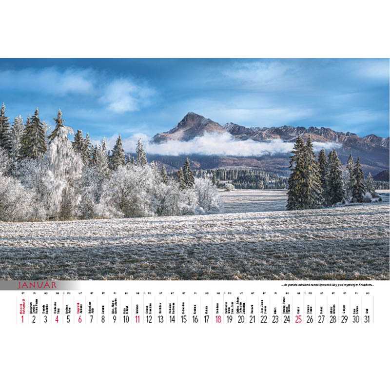 Kochajte sa celý rok pohľadom na horské štíty, hlboké údolia a priezračné jazerá, ktoré neprestávajú fascinovať. Pôsobivé snímky tatranskej krajiny, od Belianskych Tatier po Štrbské pleso, vám vezmú dych. Kalendár obsahuje slovenské kalendárium s menami a sviatkami a popiskami v štyroch jazykoch.Priestor na potlač: 33 x 6 cm. Rozsah: 14 listov. Rozmer: 33 x 46 x 1 cm. Hmotnosť: 0,6. Papier: 150 g/m2. Väzba: dvojitá špirála. Kalendárium: slovenské.