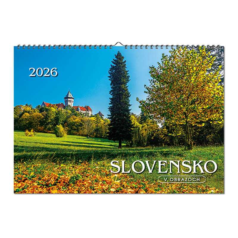 Kalendár Slovenská krajina 2026. Formát kalendára: 31,5 x 45 cm . Kalendárium: slovenské trojmesačné menné . Rozsah kalendára: 14 listov . Twinová väzba . Priestor na potlač: 31,5 x 7 cm
