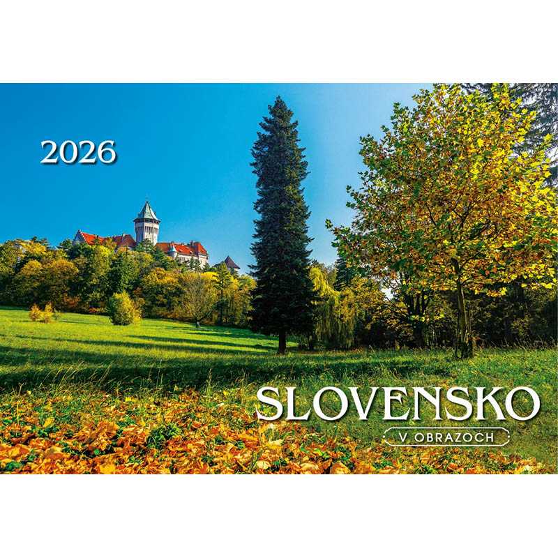 Nástenný kalendár Slovensko 2026. Formát kalendára: 31,5 x 45 cm. Kalendárium: slovenské mesačné mennné. Rozsah kalendára: 14 listov. Twinová väzba. Priestor na potlač: 31,5 x 7 cm