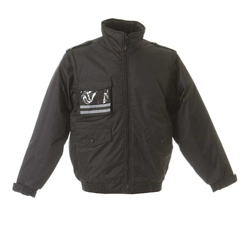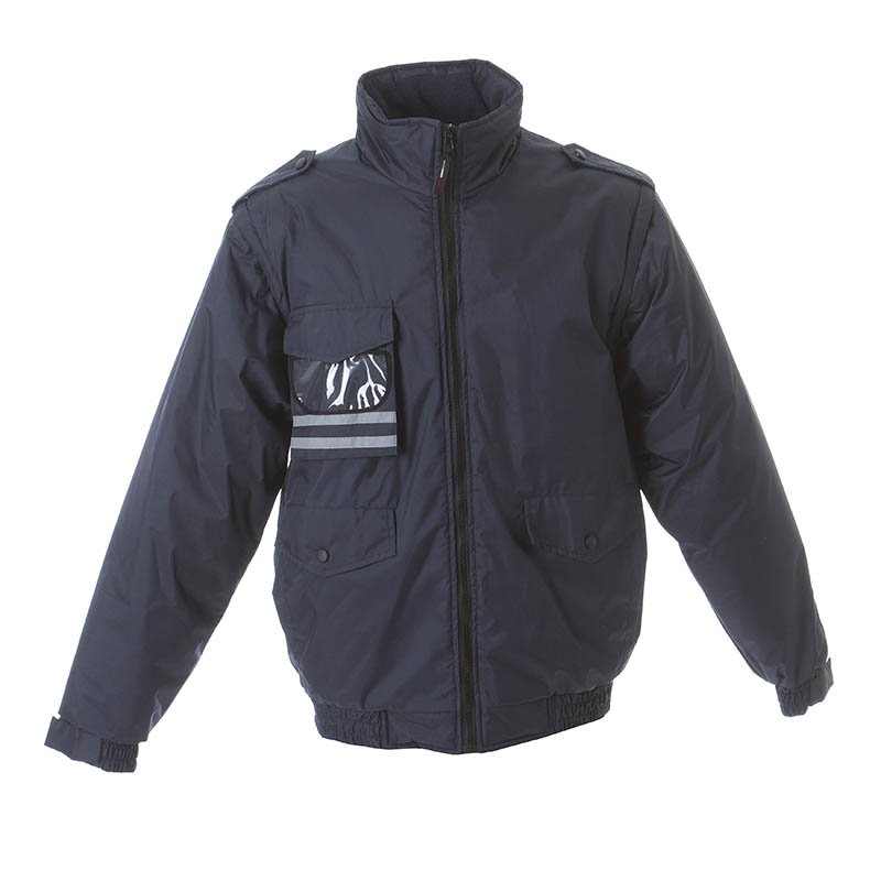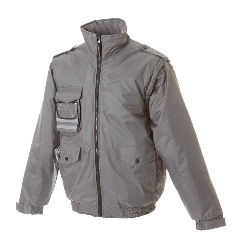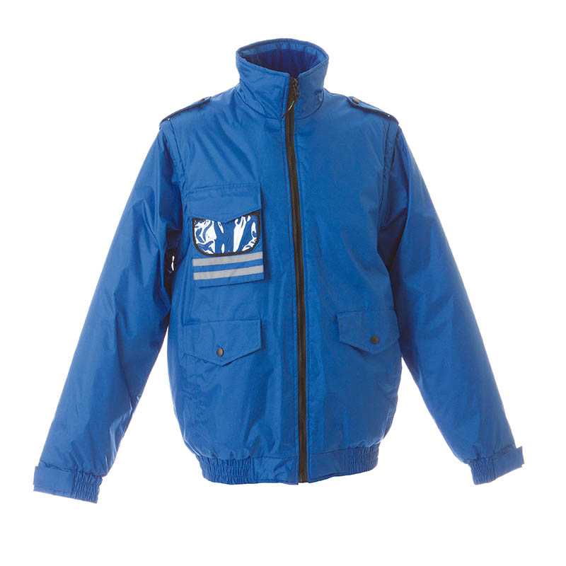 "Jacket in polyester pongee - PVC-coated - Polyester padding - Detachable sleeves - Polyester lining - Pull-out hood in polyester pongee - Reflective thin band - Chest pocket with fold-away badge-pocket and mobile holder inside - Two double-pockets with fl"