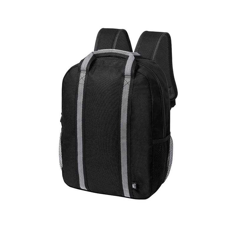 NOVINKA 2025. Backpack made of durable RPET 600D polyester, designed with reflective strips on the front for greater visibility. Includes a spacious main compartment and a practical front pocket, both with zipper closure for easy access. Additionally, it features padded and adjustable back and straps.RPET material is made from recycled plastic to promote the reuse of plastic waste and help the sustainability of the planet.