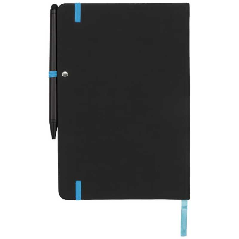 Moderní a stylový černý zápisník s obálkou měkkou na dotek. Dodáváno s barevným lemováním a shodně zbarvenou záložkou stránek, s poutkem na pero a zajišťovací páskou. Dodáváno s jednoduchým černým kuličkovým perem sloužícím také jako stylus. Obsahuje 96 listů krémového linkovaného papíru (70g/m2).