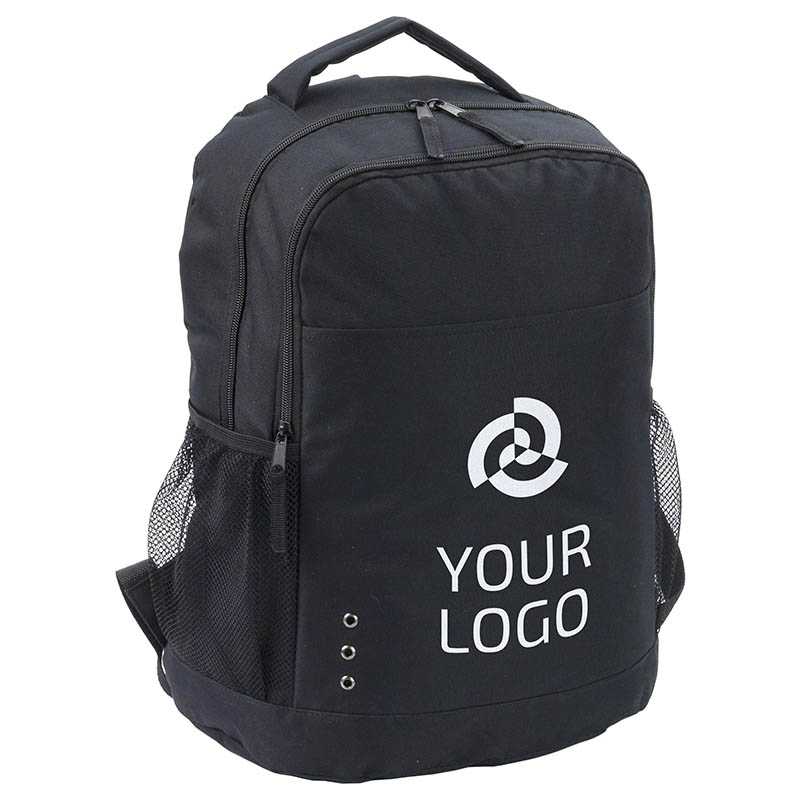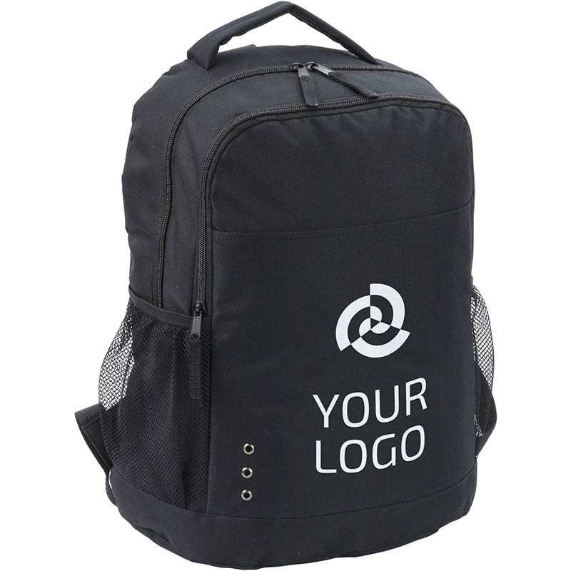 Polyester (600D) backpack with zippered front pocket, two mesh side pockets, and adjustable shoulder straps.
