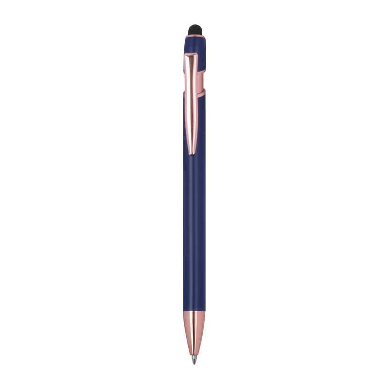 Aluminium ballpen with rubber tip for capacitive screens and twist action mechanism. Blue ink.