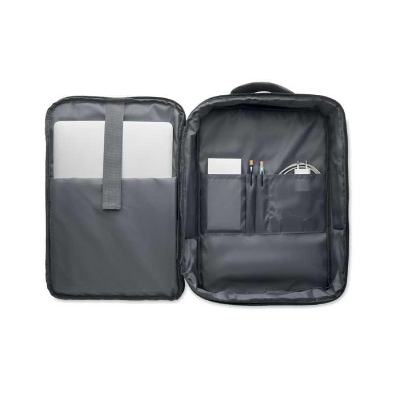 Batoh na 15palcový notebook z materiálu 300D RPET a podšívkou z materiálu 210D RPET. Obsahuje přihrádku na notebook, 2 vnitřní kapsy na drobnosti, 2 vnitřní kapsy na pera a 2 polstrovaná ucha na přenášení. Měkce polstrovaná záda a ramenní popruhy. Držák n