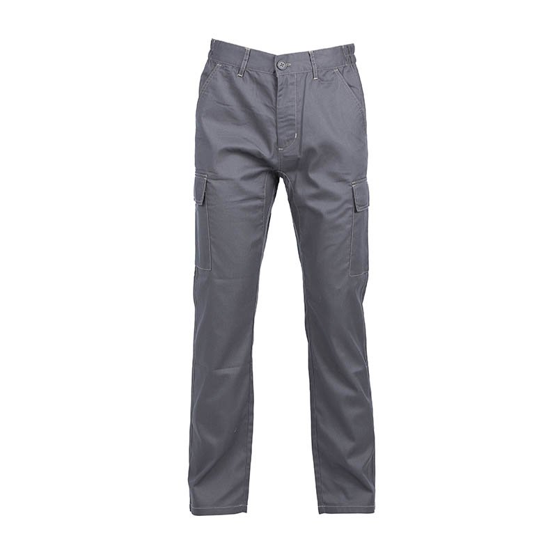 Front zip with button Elastic waistband Rear safety seam Darts Three pockets: 2 French pockets 1 back welt pocket with cover flap and button 1 right leg tool pocket