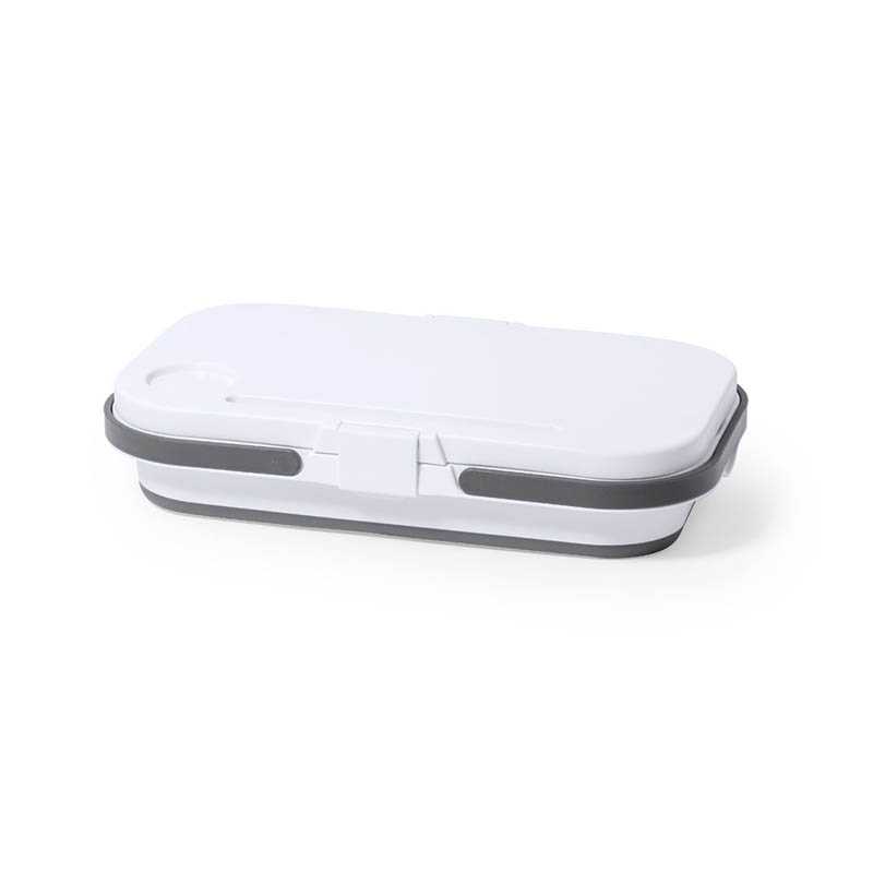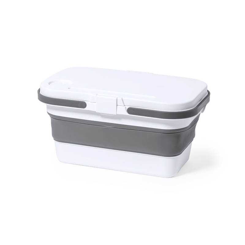 NOVINKA 2025. Foldable, multifunctional picnic cooler basket. Made of resistant PP material in white finish, with a capacity of 16 litres. Lid convertible into a table by means of 2 folding legs, with built-in holders for smartphone/tablet and bottle. Including 2 folding carry handles in grey. Small size when folded, ideal for an easy storage.