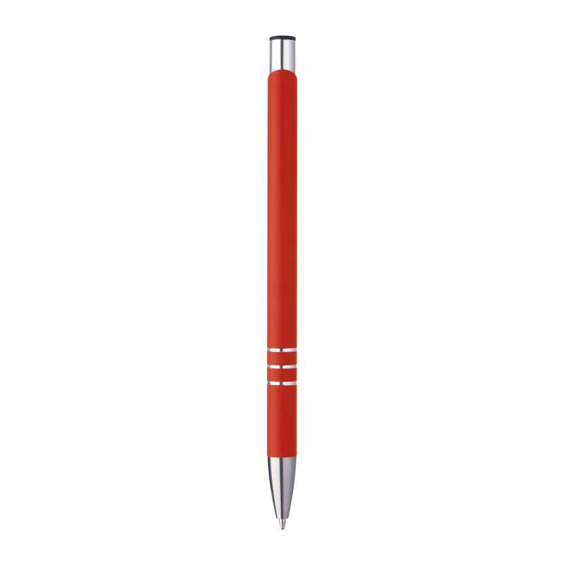 Štíhle kovové guľôčkové pero s pogumovaným povrchom a modrou plastovou náplňou.