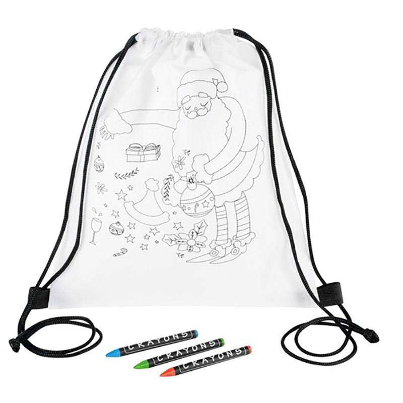 Drawstring bag for colouring COLOURFUL SANTA : with printed Christmas design, 3 wax crayons