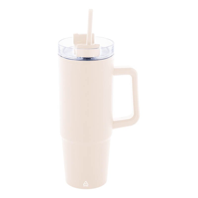 NOVINKA 2025. Dvojstenný termo hrnček z recyklovaného PP plastu s plastovým viečkom na pitie a slamkou. 900 ml.