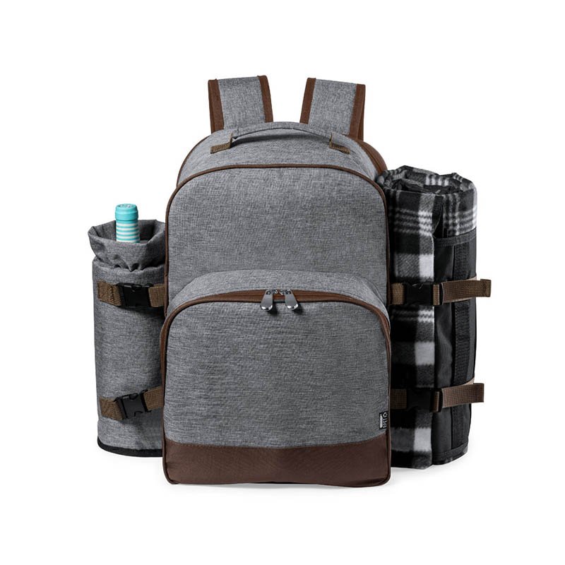 NOVINKA 2025. 4 service picnic cooler backpack with a full range of accessories, made of resistant 600D RPET. Grey finish with brown details carry handle and adjustable padded shoulder straps. Main compartment with zip closure and metal pullers. EVA isothermal inside and outside label with the RPET distinctive. Including: 4 mugs in stainless steel. 4 spoons, 4 knives and 4 forks in stainless steel with PP white handle. 1 spreader knife in stainless steel with white PP handle. 4 white PP plates, 23 cm in diameter. 4 cloth napkins 30 x 30 cm. With retro design in checkered pattern and in combination of black, grey and white tones. Corkscrew opener in stainless steel with white PP handle. Transparent salt and pepper pots with white PP cap. Wooden cutting and display board, size 15x15 cm. Foldable bag inside. Matching thermal bottle holder on the right side, made of RPET and removable with buckle closures. Premium quality picnic blanket on the left side, with adjustable buckle closures. Size 120x150cm, with soft-touch sitting side in two-tone tartan pattern. Insulated base in durable PEVA. Easy to fold and compact in size, including carry handle and flap with velcro fastening. RPET material is made from recycled plastic, to encourage the reuse of plastic waste and help the sustainability of the planet.