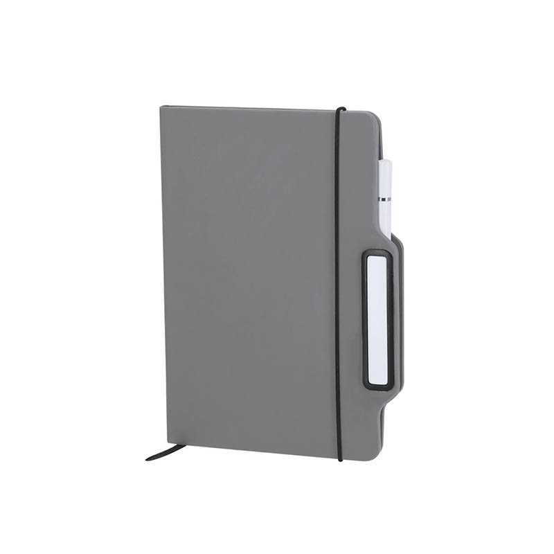 NOVINKA 2025. Notepad Holder made of soft PU leather. With hard covers, it includes a smartphone holder on the cover. It includes an eternal writing pen in white color. With 80 plain cream coloured pages inside, black elastic closure and matching bookmark.