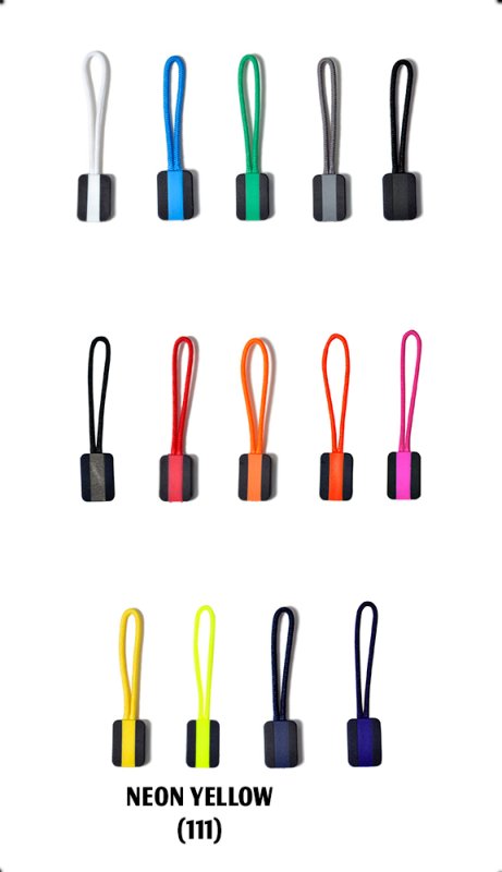Complete the look with zip pullers in your colours. Comes in sets of 4 zip pullers. 400 red, 307 orange, 220 yellow, 100 white, 935 steel grey, 728 fresh green, 632 ocean blue, 600 navy, 949 reflective, 171 neon orange, 111 neon yellow, 250 pink TPU (thermoplastic polyurethane)