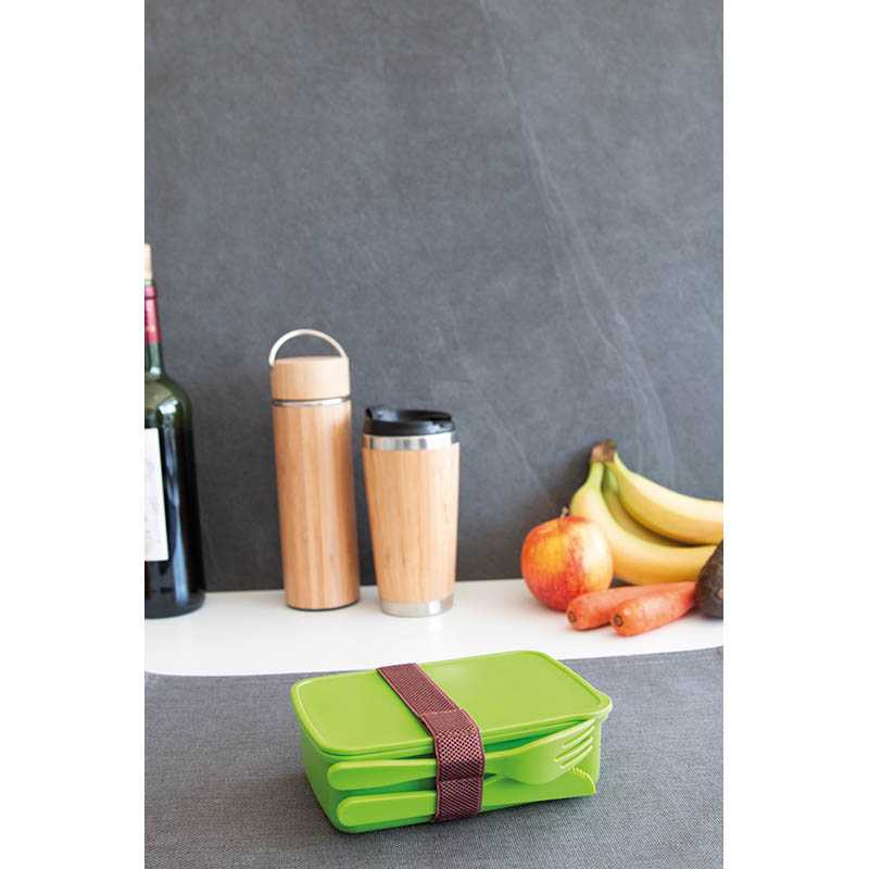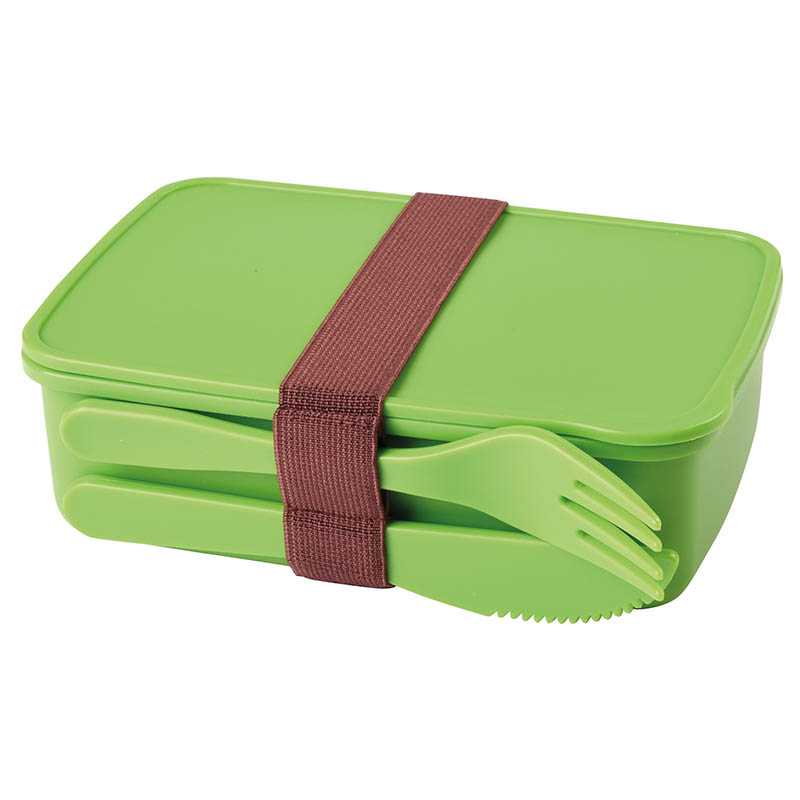Obedový box z PP plastu so súpravou príborov (nôž a vidlička) a elastickým popruhom. 700 ml.