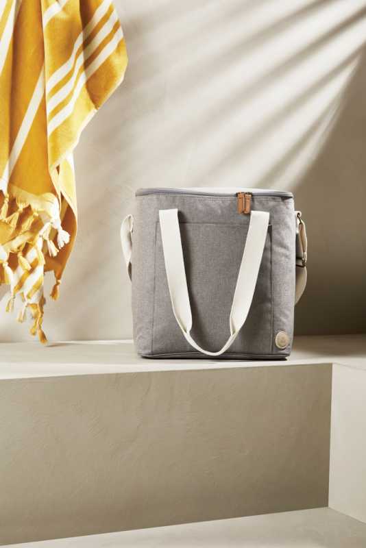 Táto módna chladiaca taška vám určite uľahčí víkendový výlet. Navyše je praktická a ľahko sa čistí. Chladiaca taška je vyrobená z melanžovej tkaniny s PU detailmi, vďaka ktorým je rovnako módna ako bežná taška. Na prednej strane tašky sa nachádza vrecko, do ktorého si môžete uložiť potrebné veci. Môžete ju nosiť v ruke alebo cez rameno.
