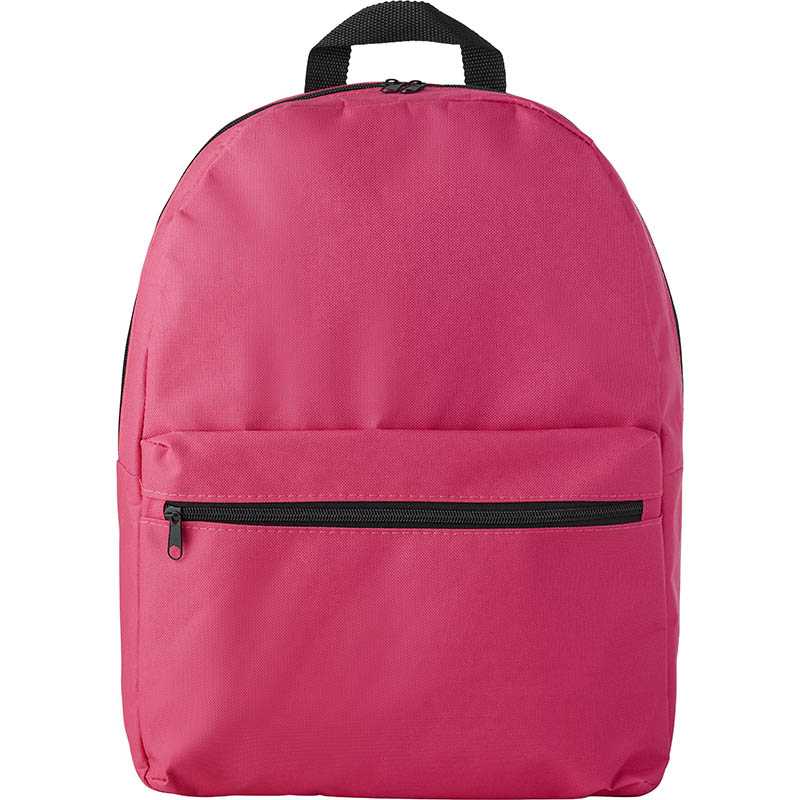 Polyester (600D) backpack with zipper on the main compartment and front pocket. The bag has adjustable, padded shoulder straps.