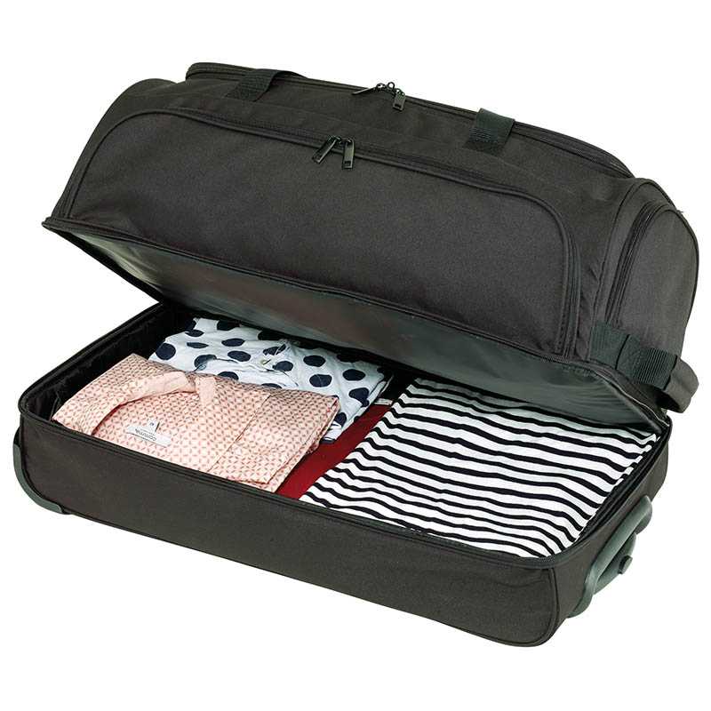 Trolley travel bag BERGEN: 2 carrying handles with touch fastener strengthening, 1 zippered front pocket, 2 separate packing compartments with zips, 1 zippered pocket at the side, padded carrying handle, retractable trolley system, easy-running skater whe