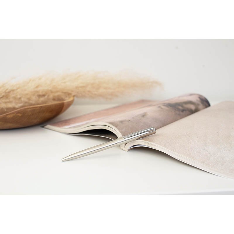 Telo z brúsenej nehrdzavejúcej ocele. V kombinácii s pochrómovaným klipom, s leštenou úpravou. Guľôčkové pero: stláčací mechanizmus modrá náplň pre guľôčkové perá Vyrobené vo Francúzsku Dodávané v elegantnom darčekovom balení.