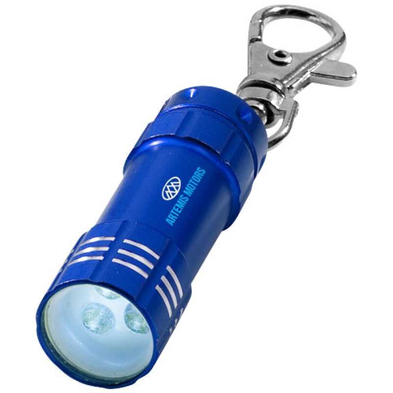 Mini hliníková baterka s 3 LED diódami, otváračom na fľaše a príveskom na kľúče. Dodávané s gombíkovou batériou.