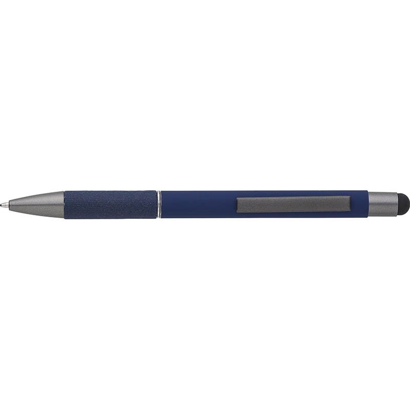 Aluminium ballpen with rolled paper details on the grip. Rubber tip for capactive screens. Blue ink.