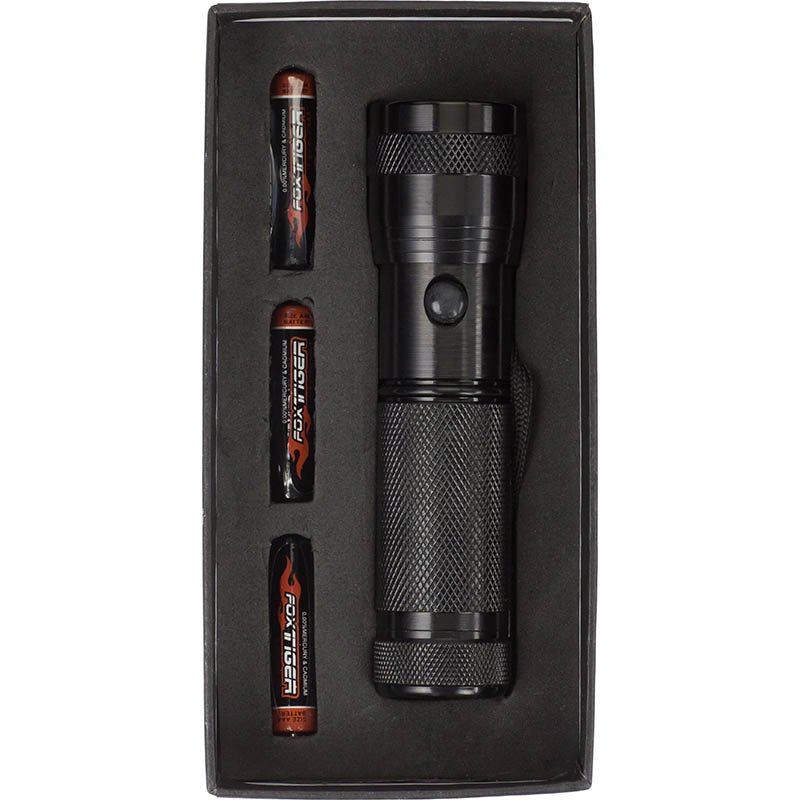 Svítilna s 9 LED. Praktická svítilna s 9 jasnými LED, s černým pryžovým držadlem a kovovou hlavou. Baleno v dárkové kazetě STAC. Součástí jsou baterie vložené do produktu. Exkluzivní design. Kov a guma.