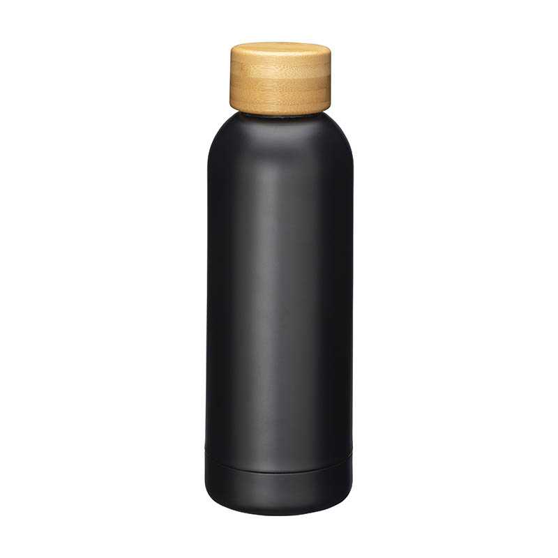 Stainless steel thermal bottle with double-walled insulation enhancing capacity and bamboo cap, 500 ml capacity. Maintains the temperature of both hot and cold beverages for up to 12 hou