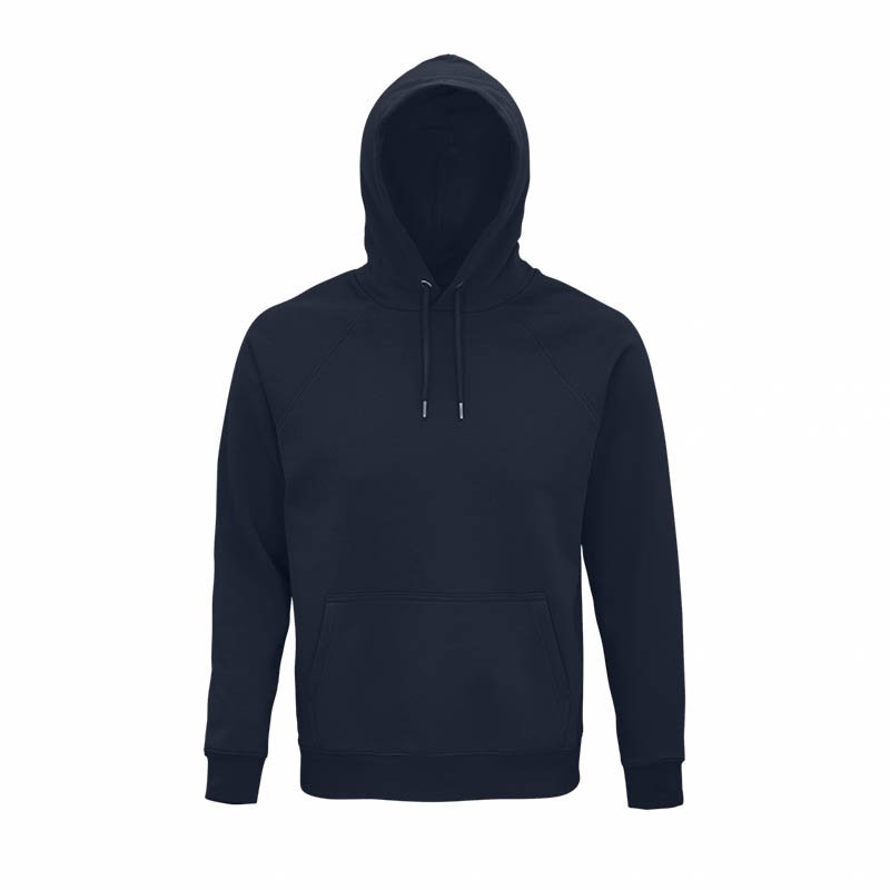 Kvalita.80 % organicky pestovaná bavlna – 20 % recyklovaný polyester.3 priadze .Kartáčovaná podšívka.Zvonku: 100 % organická bavlna.Štýl.Strihané a šité.Raglánové rukávy.2 x 2 rebrované manžety a spodný okraj.Polmesiac vnútri goliera.Páska na krku.Sťahovacia šnúrka s kovovými očkami a zátkami.Kapucňa s podšívkou z džerseja.