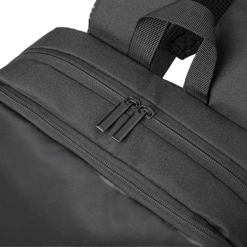 Batoh z 600D RPETu s tmavými popruhy vpředu a reflexním předním panelem. Síťované kapsy na obou stranách.